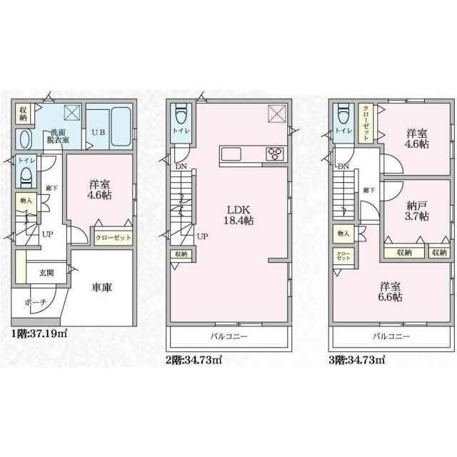 | 間取り(内訳) | 3SLDK(洋6.6/4.6/4.6S3.7LDK18.4) | 建物面積 | 106.65㎡ |